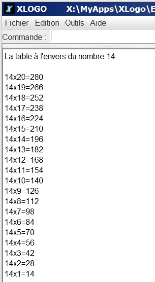 Construire un programme qui va demander à l'utilisateur d'entrer un nombre (1) et ensuite afficher la table à l'envers de ce nombre (2).